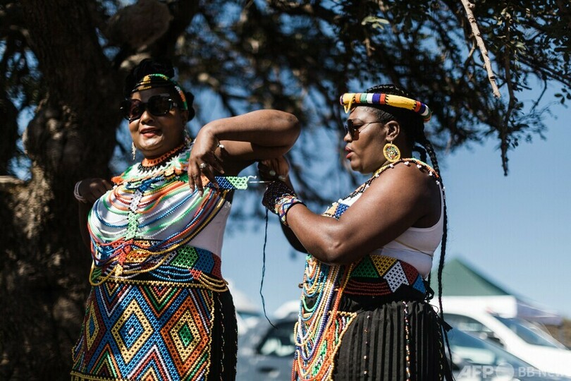 南東部クワズールー・ナタール(KwaZulu Natal)州ノンゴマ(Nongoma)にあるズールー王宮の外には、早朝から色とりどりの伝統衣装をまとった男女が集まり、新王の即位を祝った。