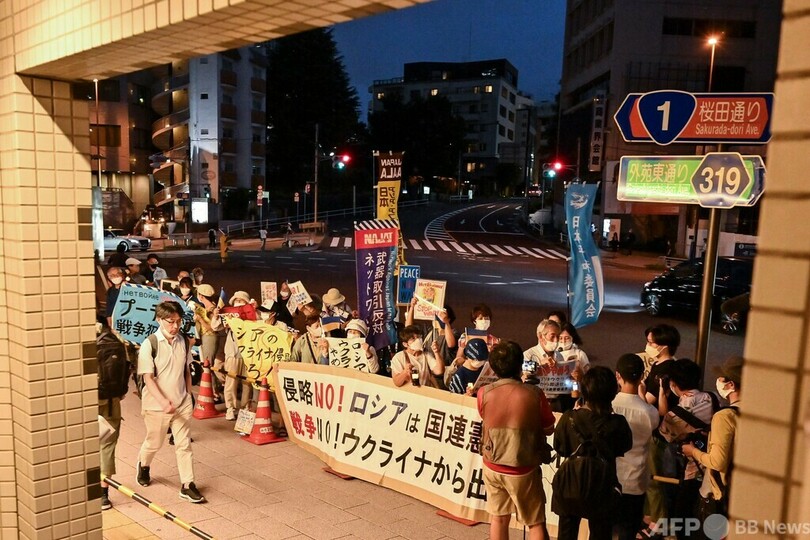 【8月25日 AFP】ロシアのウクライナ侵攻開始から半年となる24日、東京都港区のロシア大使館付近で小規模な抗議デモが行われた。参加者らは「戦争反対」などと書かれたプラカードなどを掲げた。この日はウクライナの独立記念日にも当たる。(c)AFP