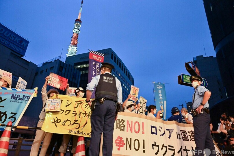 【8月25日 AFP】ロシアのウクライナ侵攻開始から半年となる24日、東京都港区のロシア大使館付近で小規模な抗議デモが行われた。参加者らは「戦争反対」などと書かれたプラカードなどを掲げた。この日はウクライナの独立記念日にも当たる。(c)AFP