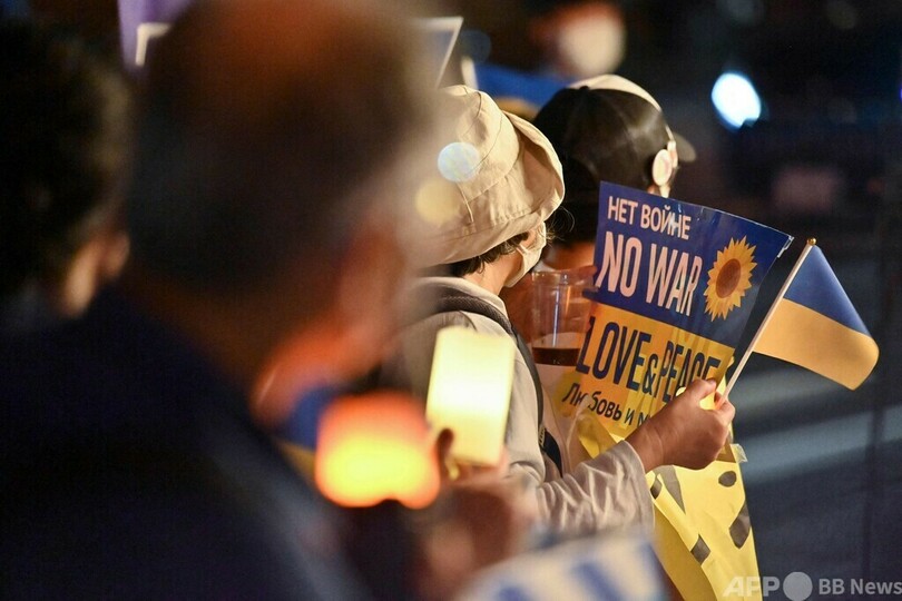 【8月25日 AFP】ロシアのウクライナ侵攻開始から半年となる24日、東京都港区のロシア大使館付近で小規模な抗議デモが行われた。参加者らは「戦争反対」などと書かれたプラカードなどを掲げた。この日はウクライナの独立記念日にも当たる。(c)AFP