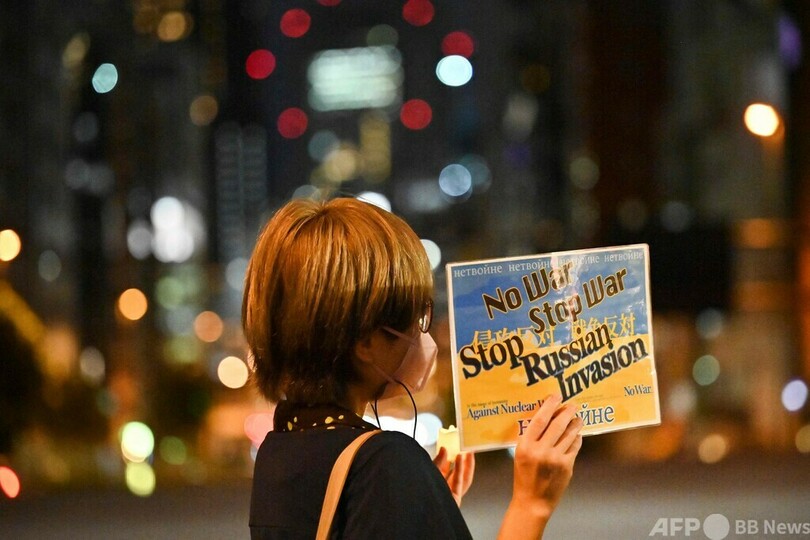 【8月25日 AFP】ロシアのウクライナ侵攻開始から半年となる24日、東京都港区のロシア大使館付近で小規模な抗議デモが行われた。参加者らは「戦争反対」などと書かれたプラカードなどを掲げた。この日はウクライナの独立記念日にも当たる。(c)AFP