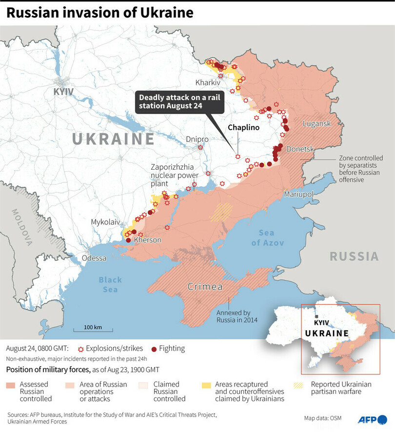 【8月25日 AFP】(写真追加)ウクライナ中部ドニプロペトロウシク(Dnipropetrovsk)州で行われた鉄道駅攻撃について、ロシア国防省は25日、200人以上のウクライナ兵を殺害したと発表した。一方でウクライナ当局は、攻撃で子どもを含む25人が死亡したとしている。