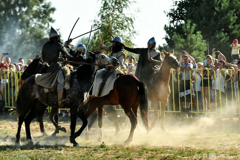 【9月4日 AFP】よろいかぶとに身を固めた数十人が死んだ兵士を演じる中で、ロシア中世の英雄アレクサンドル・ネフスキー(Alexander Nevsky)に扮(ふん)した男性が剣を振り上げ大声でうなった。