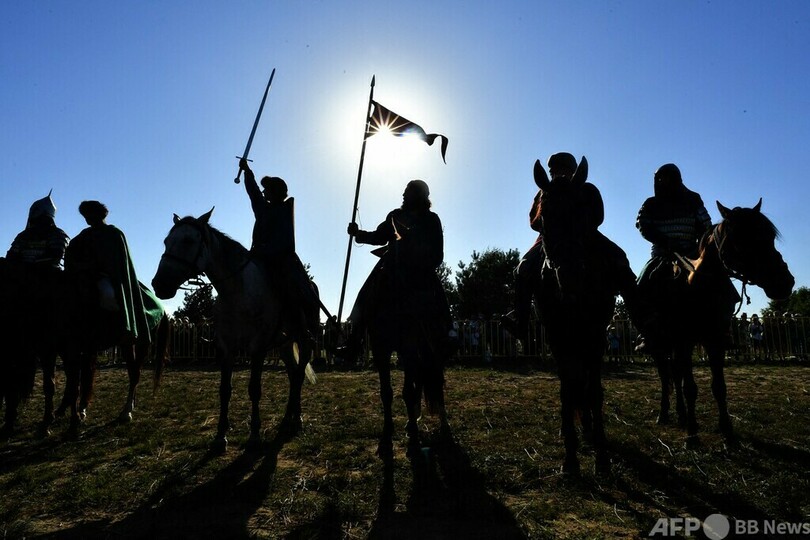 【9月4日 AFP】よろいかぶとに身を固めた数十人が死んだ兵士を演じる中で、ロシア中世の英雄アレクサンドル・ネフスキー(Alexander Nevsky)に扮(ふん)した男性が剣を振り上げ大声でうなった。