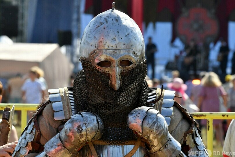 【9月4日 AFP】よろいかぶとに身を固めた数十人が死んだ兵士を演じる中で、ロシア中世の英雄アレクサンドル・ネフスキー(Alexander Nevsky)に扮(ふん)した男性が剣を振り上げ大声でうなった。