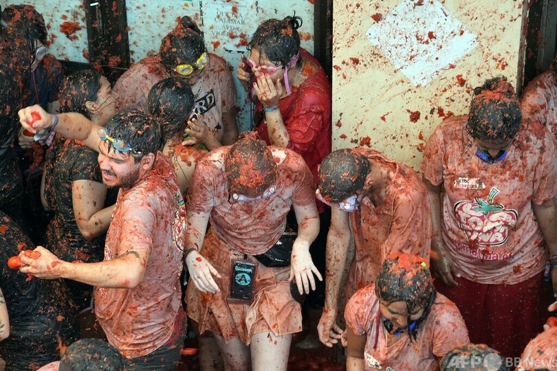 約1時間続く祭りに向け、完熟トマト130トンがトラック6台で運び込まれた。正午に打ち上げられた花火を合図に、街は赤色に染まった。