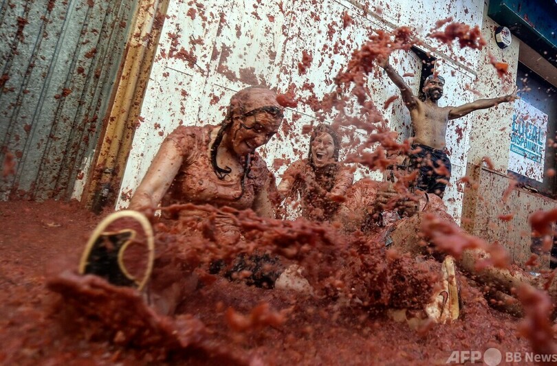 約1時間続く祭りに向け、完熟トマト130トンがトラック6台で運び込まれた。正午に打ち上げられた花火を合図に、街は赤色に染まった。