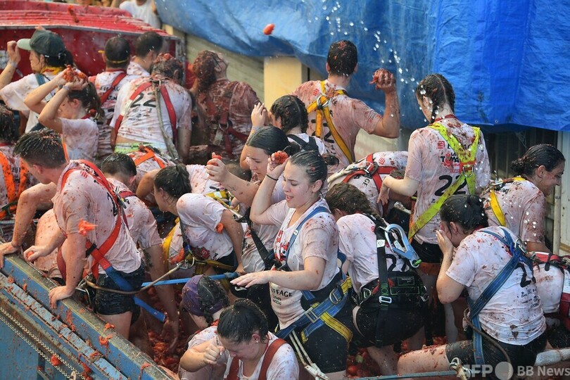 約1時間続く祭りに向け、完熟トマト130トンがトラック6台で運び込まれた。正午に打ち上げられた花火を合図に、街は赤色に染まった。