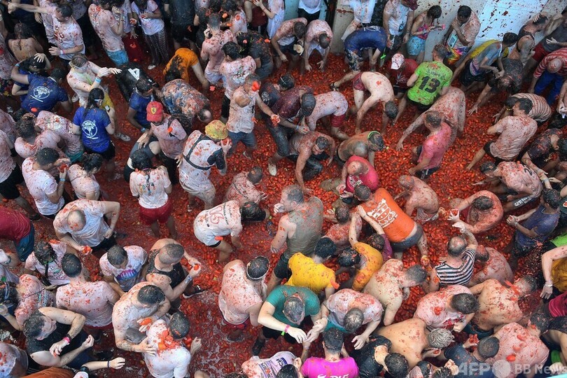 約1時間続く祭りに向け、完熟トマト130トンがトラック6台で運び込まれた。正午に打ち上げられた花火を合図に、街は赤色に染まった。