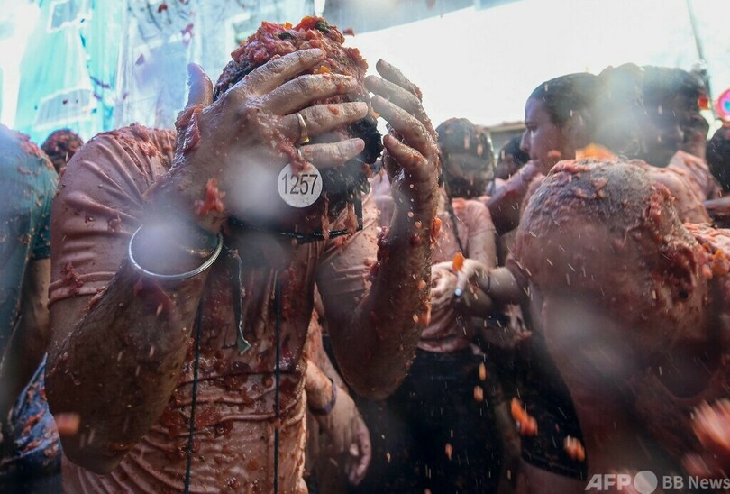 【9月1日 AFP】スペイン東部ブニョール(Bunol)で8月31日、恒例のトマト祭り「トマティーナ(Tomatina)」が開催された。新型コロナウイルスの影響で2年間中止されていた。