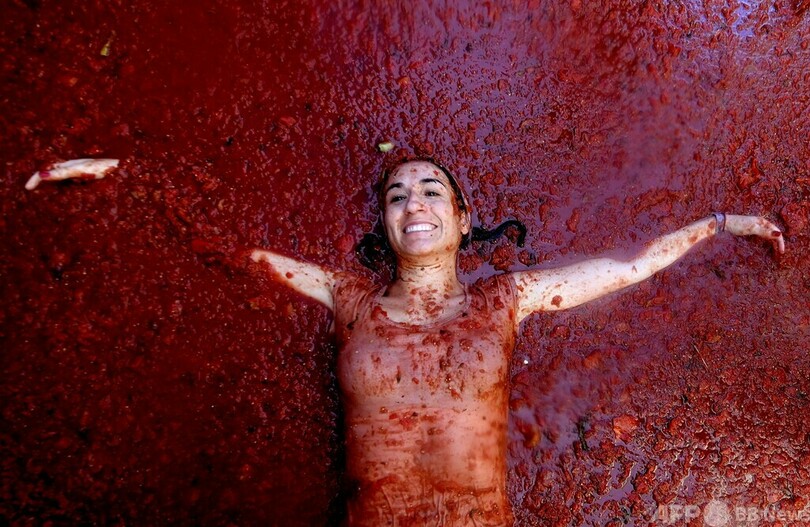 約1時間続く祭りに向け、完熟トマト130トンがトラック6台で運び込まれた。正午に打ち上げられた花火を合図に、街は赤色に染まった。