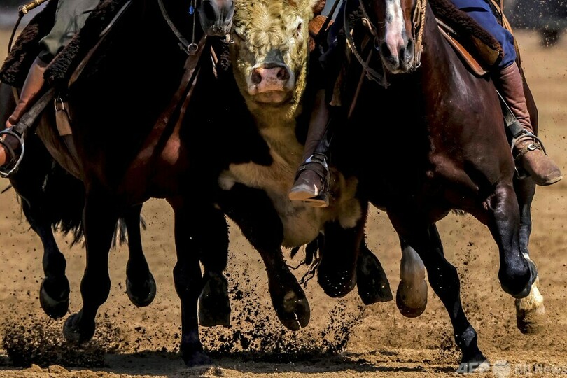 【今日の1枚】完璧な連携プレー、挟み撃ちで牛を追い込む