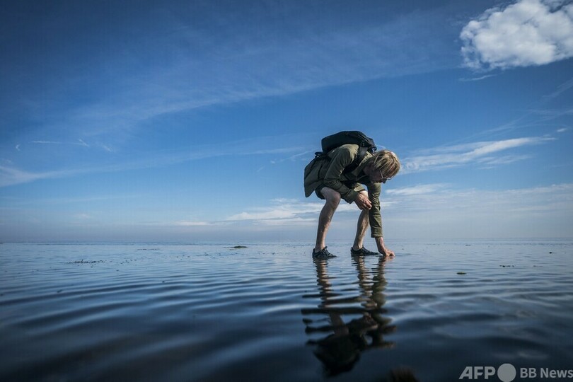 【9月17日 AFP】オランダ・フリーント(Griend)島近くにある整備された藻場に手を浸す調査会社の職員。公共事業と水質管理を担う同国の公共事業局は春に、70万個の海草の種をワッデン海(Wadden Sea)にまいた。海の森である藻場は、もっとも実りのある生態系だが、オランダではすでにほぼ完全に消滅している。(c)AFP