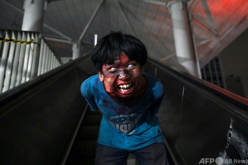 イベントでは、ゾンビに扮(ふん)した役者が足を引きずって近づいてくると、乗客は駅の暗いトンネルを抜けて列車に走り乗る。