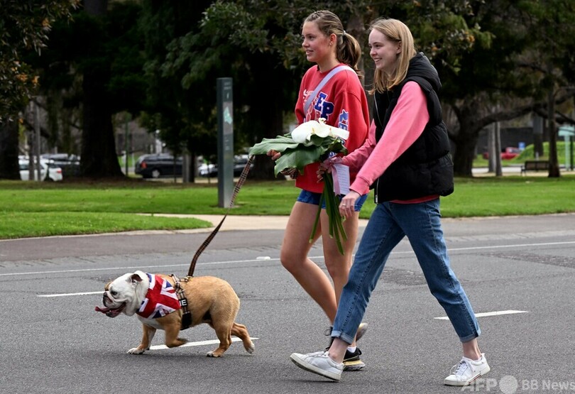 【9月10日 AFP】英国のエリザベス女王(Queen Elizabeth II)の死去を受け、豪メルボルンの総督府では9日、人々が記帳して弔意を示した。女王にちなみ「リジー」と名付けられたブリティッシュ・ブルドッグを連れた飼い主の姿も見られた。(c)AFP