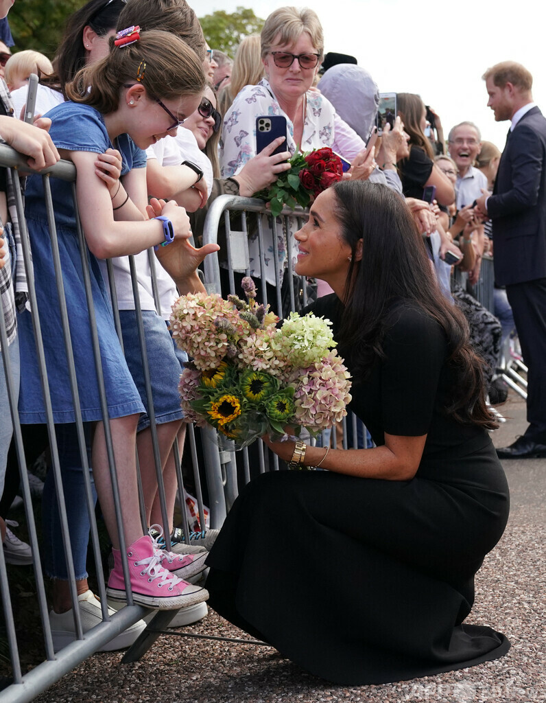 両夫妻は、追悼のためウィンザー城の前に集まっていた人々の前にサプライズ登場。女王にささげられた花束やメッセージを見たり、人々に話し掛けたりした。(c)AFP