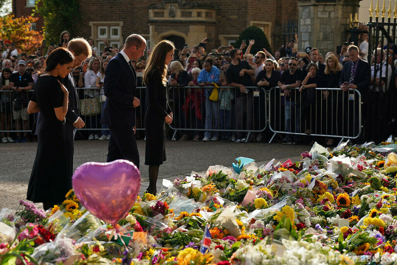 両夫妻は、追悼のためウィンザー城の前に集まっていた人々の前にサプライズ登場。女王にささげられた花束やメッセージを見たり、人々に話し掛けたりした。(c)AFP