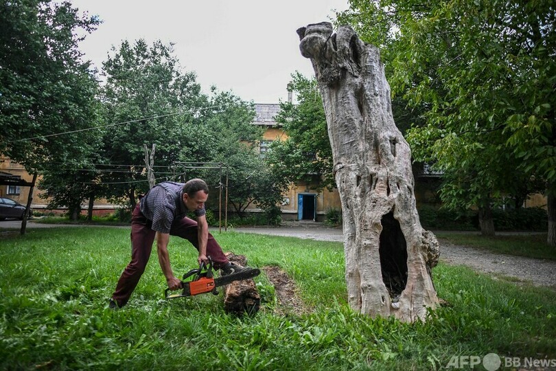 【9月18日 AFP】ウクライナ東部ドネツク(Donetsk)州クラマトルスク(Kramatorsk)の住宅地で、オレクサンドル・マトビエウスキさん(42)は枯れ木を切り、たきつけを作っている。