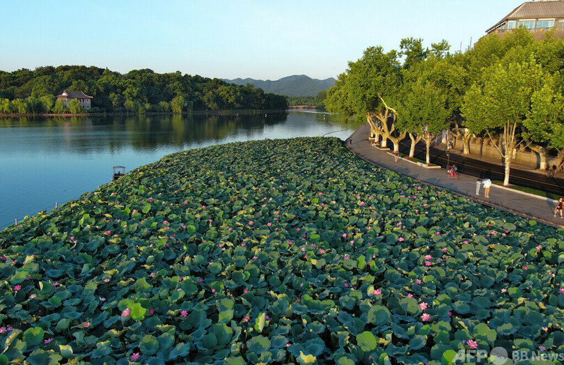 西湖の一角、北里湖(Beili Lake)では、密集したハスの葉が他のハスを隠して成長を妨げることがないよう、職員が葉っぱや花托を間引き、インターネットでチャリティー販売している。収益金は生活困難者への支援にあてる。(c)CNS/JCM/AFPBB News