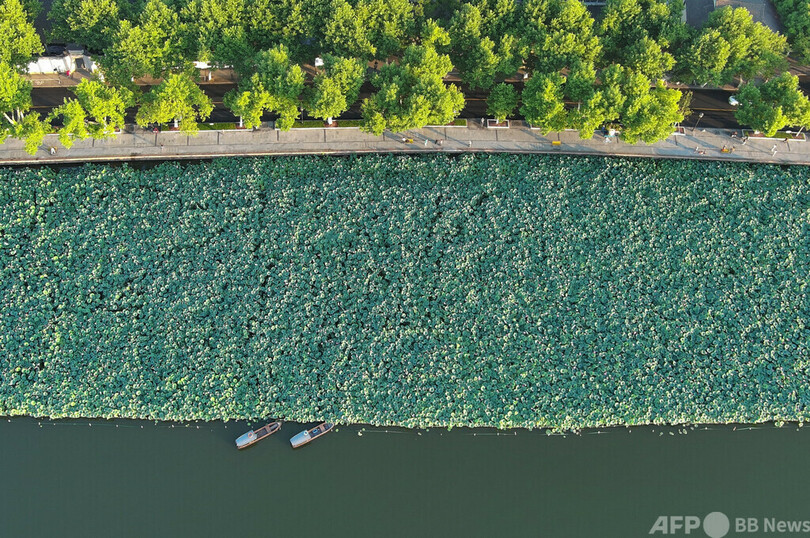 西湖の一角、北里湖(Beili Lake)では、密集したハスの葉が他のハスを隠して成長を妨げることがないよう、職員が葉っぱや花托を間引き、インターネットでチャリティー販売している。収益金は生活困難者への支援にあてる。(c)CNS/JCM/AFPBB News