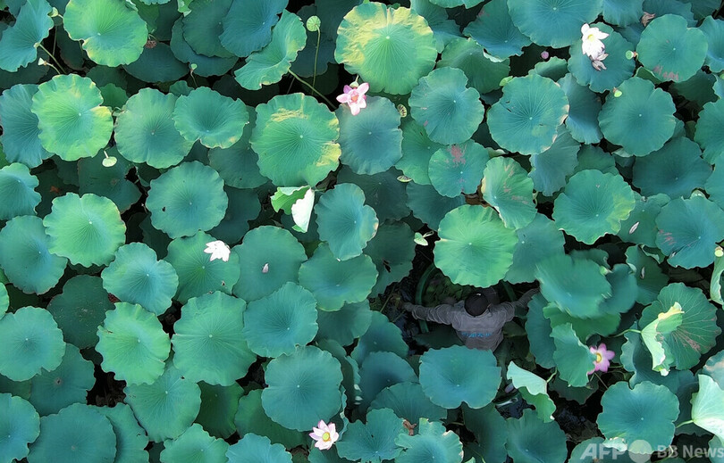 西湖の一角、北里湖(Beili Lake)では、密集したハスの葉が他のハスを隠して成長を妨げることがないよう、職員が葉っぱや花托を間引き、インターネットでチャリティー販売している。収益金は生活困難者への支援にあてる。(c)CNS/JCM/AFPBB News