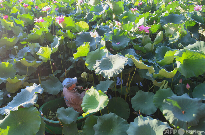 西湖の一角、北里湖(Beili Lake)では、密集したハスの葉が他のハスを隠して成長を妨げることがないよう、職員が葉っぱや花托を間引き、インターネットでチャリティー販売している。収益金は生活困難者への支援にあてる。(c)CNS/JCM/AFPBB News