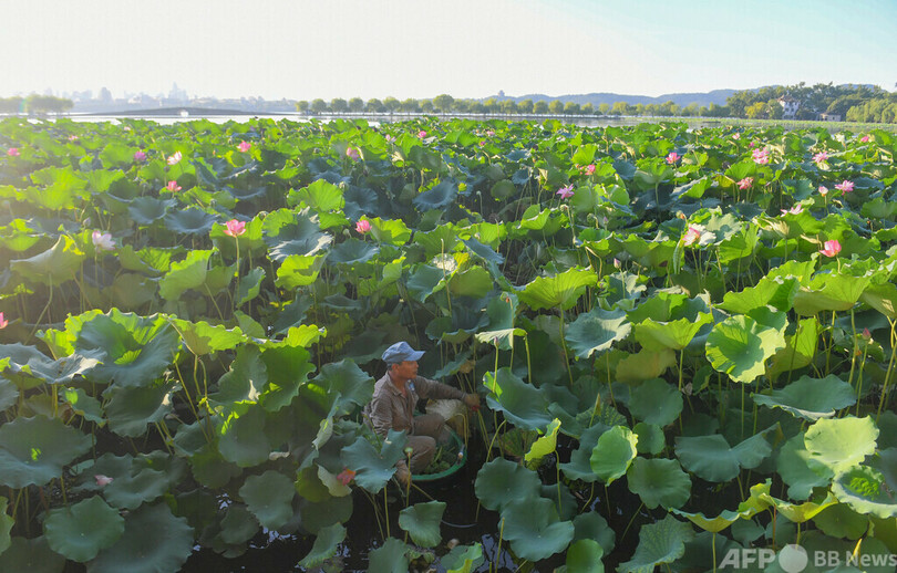 西湖の一角、北里湖(Beili Lake)では、密集したハスの葉が他のハスを隠して成長を妨げることがないよう、職員が葉っぱや花托を間引き、インターネットでチャリティー販売している。収益金は生活困難者への支援にあてる。(c)CNS/JCM/AFPBB News