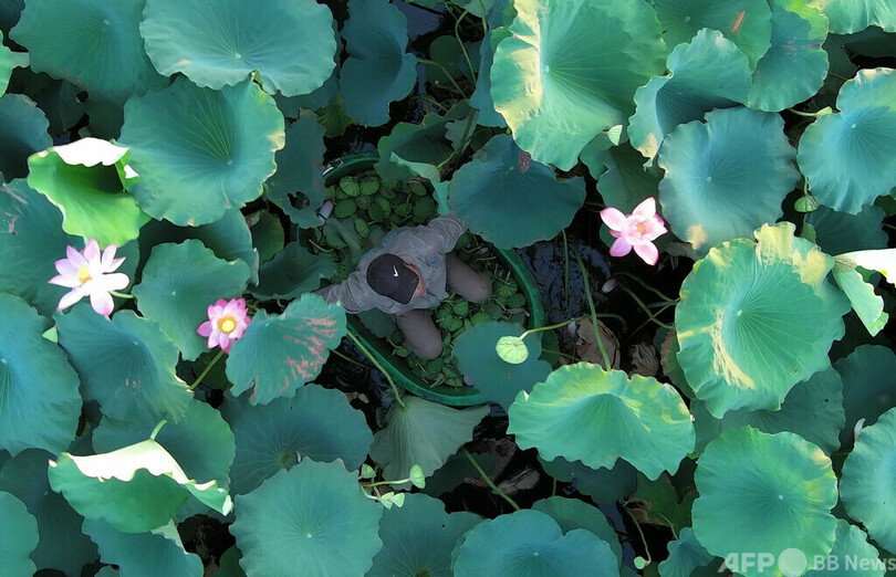 西湖の一角、北里湖(Beili Lake)では、密集したハスの葉が他のハスを隠して成長を妨げることがないよう、職員が葉っぱや花托を間引き、インターネットでチャリティー販売している。収益金は生活困難者への支援にあてる。(c)CNS/JCM/AFPBB News