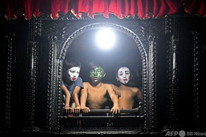 【9月21日 AFP】ネパール・カトマンズのダルバール広場(Durbar Square)で、ヒンズー教の伝統行事「インドラジャトラ(Indra Jatra)の祭り」が開かれた。劇に出演するために、顔にペイントを施し、ポーズを取る少年たち。(c)AFP