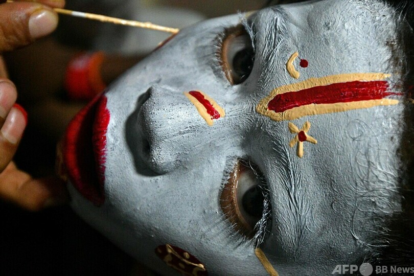 【9月21日 AFP】ネパール・カトマンズのダルバール広場(Durbar Square)で、ヒンズー教の伝統行事「インドラジャトラ(Indra Jatra)の祭り」が開かれた。劇に出演するために、顔にペイントを施し、ポーズを取る少年たち。(c)AFP