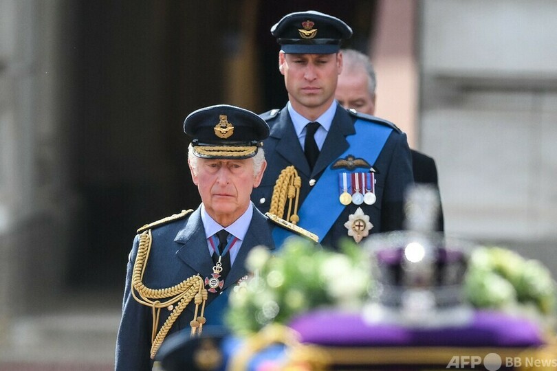 ひつぎは、1.6キロの道のりを行進。後ろには、長男のチャールズ国王(King Charles III)、国王の長男ウィリアム皇太子(Prince William)と次男のヘンリー王子(Prince Harry)ら王族が徒歩で続いた。