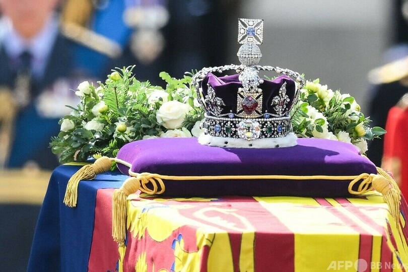 王室の旗「ロイヤル・スタンダード」に包まれ、上に王冠が置かれた女王のひつぎは午後2時22分(日本時間同10時22分)、馬が引く砲架車に載せられ、女王の住まいだった同宮殿を後にした。