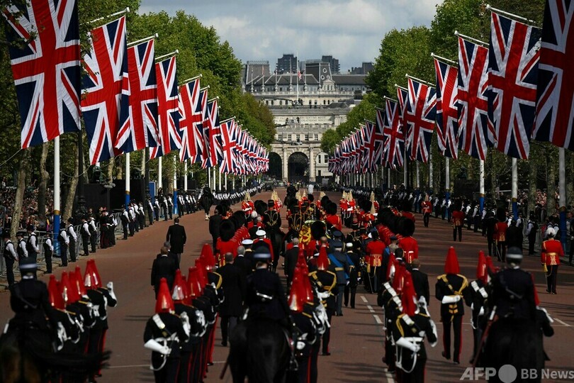 王室の旗「ロイヤル・スタンダード」に包まれ、上に王冠が置かれた女王のひつぎは午後2時22分(日本時間同10時22分)、馬が引く砲架車に載せられ、女王の住まいだった同宮殿を後にした。