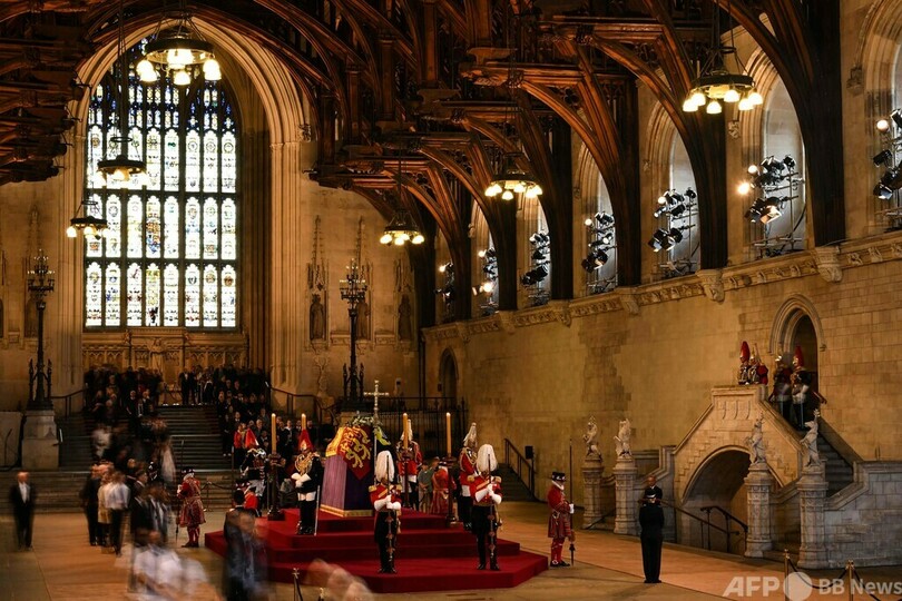 【9月15日 AFP】(写真追加)英国のエリザベス女王(Queen Elizabeth II)のひつぎが14日、首都ロンドンにある国会議事堂のウェストミンスターホール(Westminster Hall)に到着し、公開安置が始まった。国葬が行われる19日朝まで、一般市民の弔問を受け付ける。