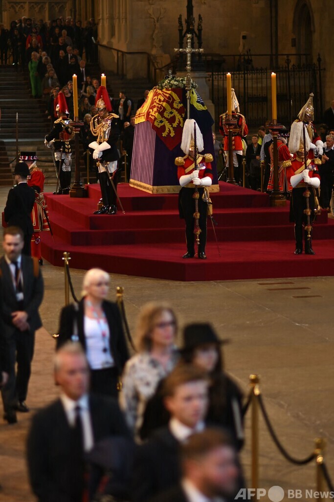 【9月15日 AFP】(写真追加)英国のエリザベス女王(Queen Elizabeth II)のひつぎが14日、首都ロンドンにある国会議事堂のウェストミンスターホール(Westminster Hall)に到着し、公開安置が始まった。国葬が行われる19日朝まで、一般市民の弔問を受け付ける。