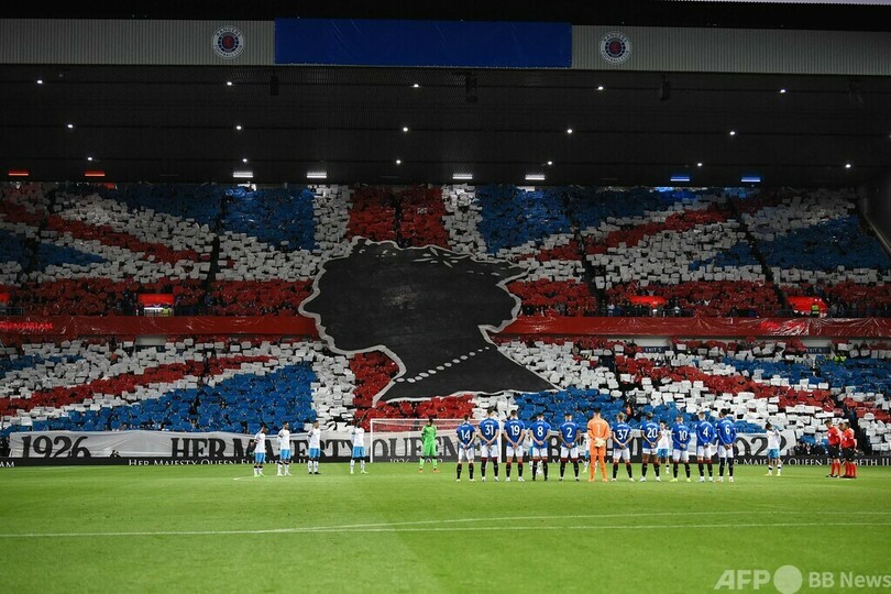 レンジャーズは、欧州サッカー連盟(UEFA)からキックオフ前に英国歌「ゴッド・セーブ・ザ・キング(God Save the King)」の使用を拒否されたものの、これを拒否し、サポーターによるコレオグラフィーとともにエリザベス女王(Queen Elizabeth II)への敬意を表した。(c)AFP