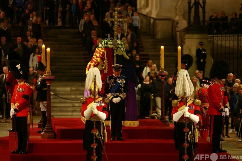 【9月17日 AFP】(写真追加)エリザベス英女王(Queen Elizabeth II)のひつぎが公開安置されている国会議事堂のウェストミンスターホール(Westminster Hall)で16日夜、長男で後継者のチャールズ国王(King Charles III)をはじめとする女王の子女4人が、ひつぎを囲む儀式を行った。