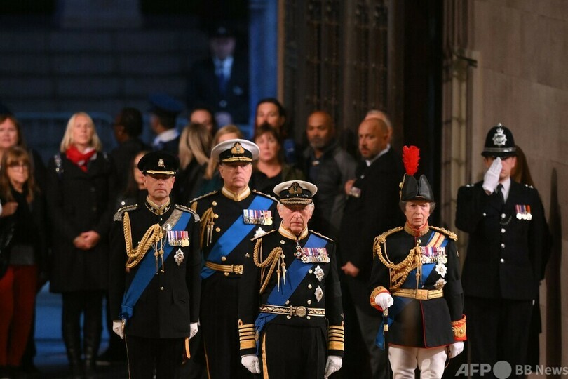 【9月17日 AFP】(写真追加)エリザベス英女王(Queen Elizabeth II)のひつぎが公開安置されている国会議事堂のウェストミンスターホール(Westminster Hall)で16日夜、長男で後継者のチャールズ国王(King Charles III)をはじめとする女王の子女4人が、ひつぎを囲む儀式を行った。