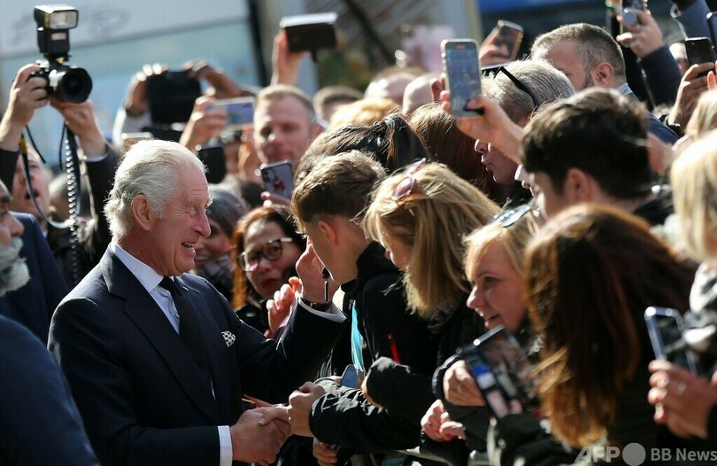国王と握手を交わした50代後半の女性は、感極まった様子で「とてもうれしい。国王は落ち着いていて、フレンドリーで、とても優しかった。最高の国王になることでしょう。その優しさと物腰の柔らかさに、女王の姿が重なった」と語った。(c)AFP