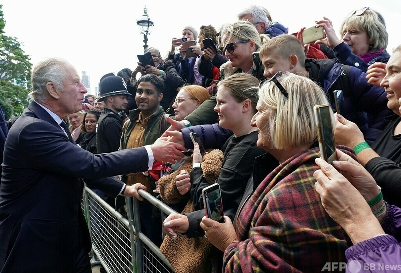 国王と握手を交わした50代後半の女性は、感極まった様子で「とてもうれしい。国王は落ち着いていて、フレンドリーで、とても優しかった。最高の国王になることでしょう。その優しさと物腰の柔らかさに、女王の姿が重なった」と語った。(c)AFP