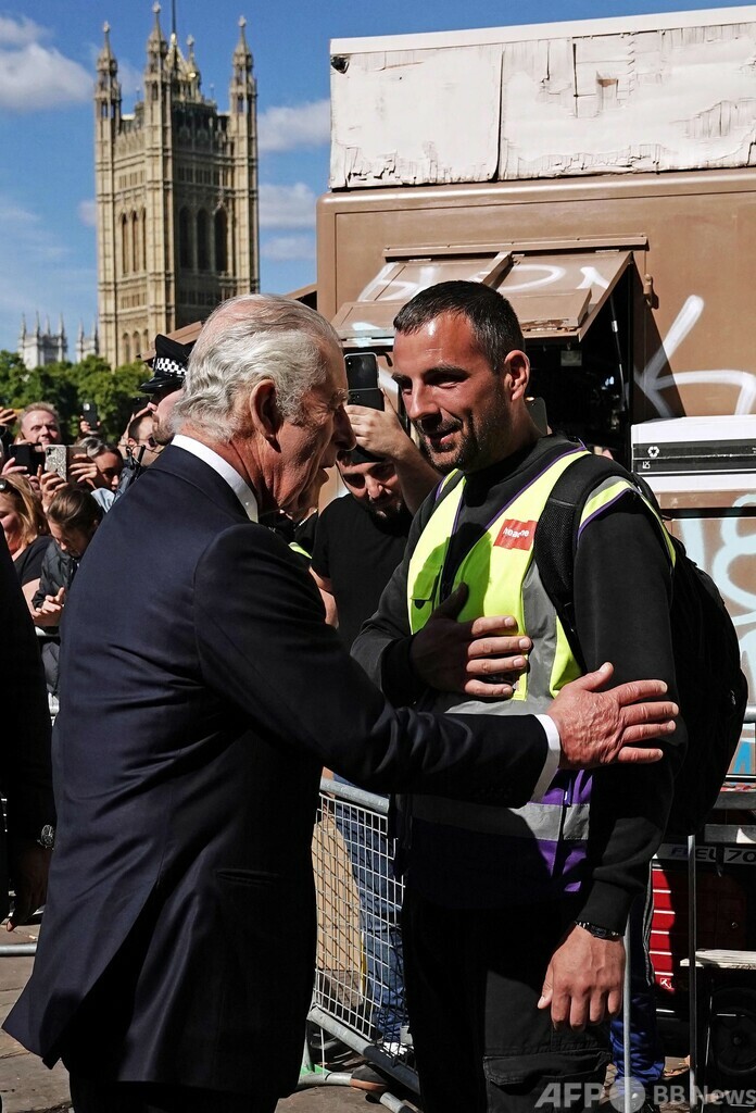 国王と握手を交わした50代後半の女性は、感極まった様子で「とてもうれしい。国王は落ち着いていて、フレンドリーで、とても優しかった。最高の国王になることでしょう。その優しさと物腰の柔らかさに、女王の姿が重なった」と語った。(c)AFP