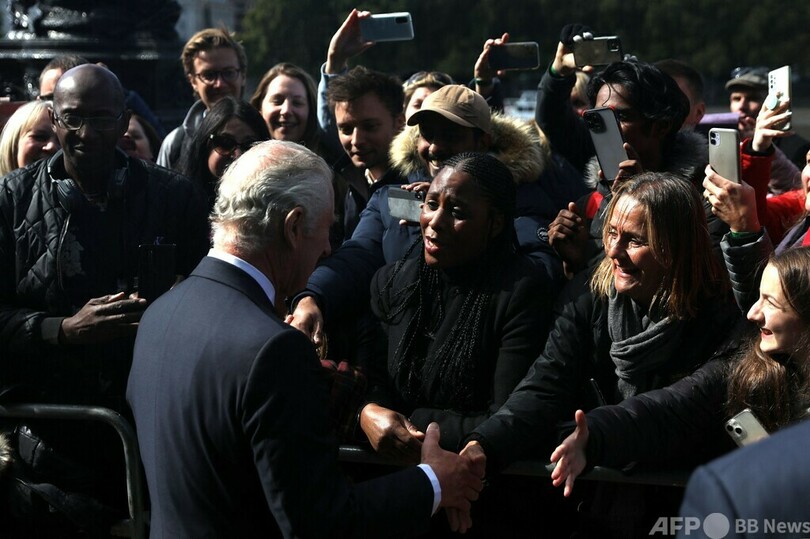 国王と握手を交わした50代後半の女性は、感極まった様子で「とてもうれしい。国王は落ち着いていて、フレンドリーで、とても優しかった。最高の国王になることでしょう。その優しさと物腰の柔らかさに、女王の姿が重なった」と語った。(c)AFP