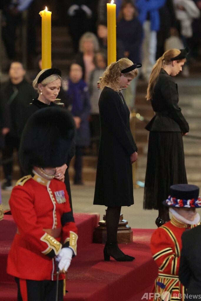 【9月18日 AFP】エリザベス英女王(Queen Elizabeth II)のひつぎが公開安置されている国会議事堂のウェストミンスターホール(Westminster Hall)で17日、女王の孫8人がひつぎを囲む儀式を行った。