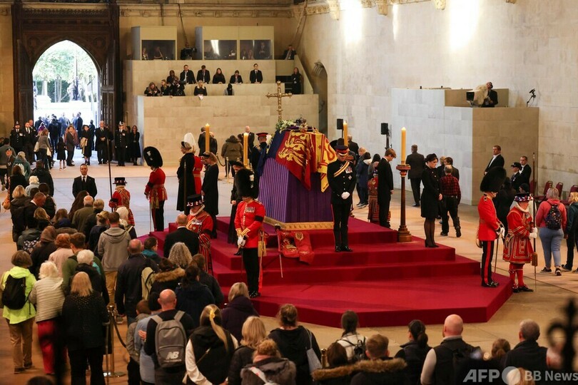 【9月18日 AFP】エリザベス英女王(Queen Elizabeth II)のひつぎが公開安置されている国会議事堂のウェストミンスターホール(Westminster Hall)で17日、女王の孫8人がひつぎを囲む儀式を行った。