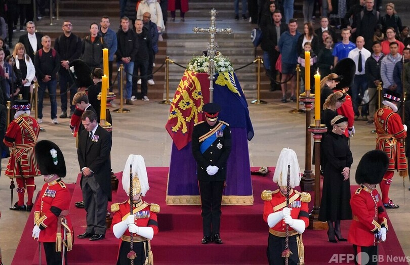 【9月18日 AFP】エリザベス英女王(Queen Elizabeth II)のひつぎが公開安置されている国会議事堂のウェストミンスターホール(Westminster Hall)で17日、女王の孫8人がひつぎを囲む儀式を行った。