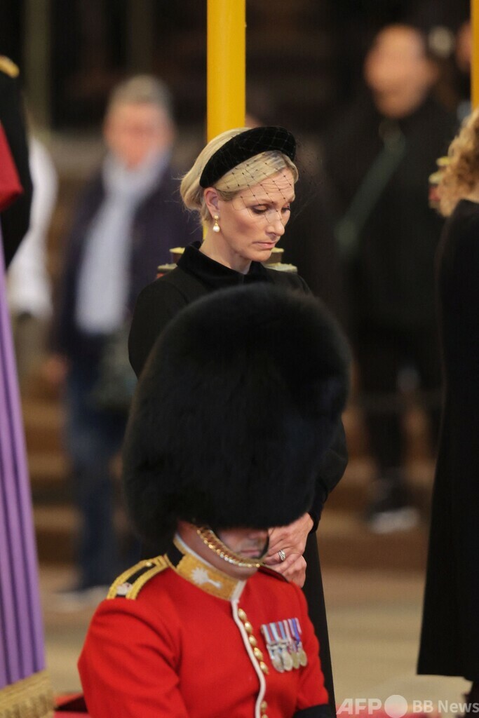 【9月18日 AFP】エリザベス英女王(Queen Elizabeth II)のひつぎが公開安置されている国会議事堂のウェストミンスターホール(Westminster Hall)で17日、女王の孫8人がひつぎを囲む儀式を行った。