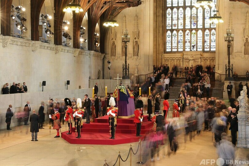 【9月18日 AFP】エリザベス英女王(Queen Elizabeth II)のひつぎが公開安置されている国会議事堂のウェストミンスターホール(Westminster Hall)で17日、女王の孫8人がひつぎを囲む儀式を行った。