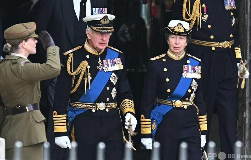 厳粛な雰囲気に包まれた葬列には、チャールズ国王(King Charles III)ら王室のメンバーが加わった。葬儀では、参列者らが2分間の黙とうをささげた。最後に、エリザベス女王の死去を受けて、歌詞が「ゴッド・セーブ・ザ・キング(God Save the King、神よ王を守りたまえ)」に変更された国歌が斉唱された。(c)AFP