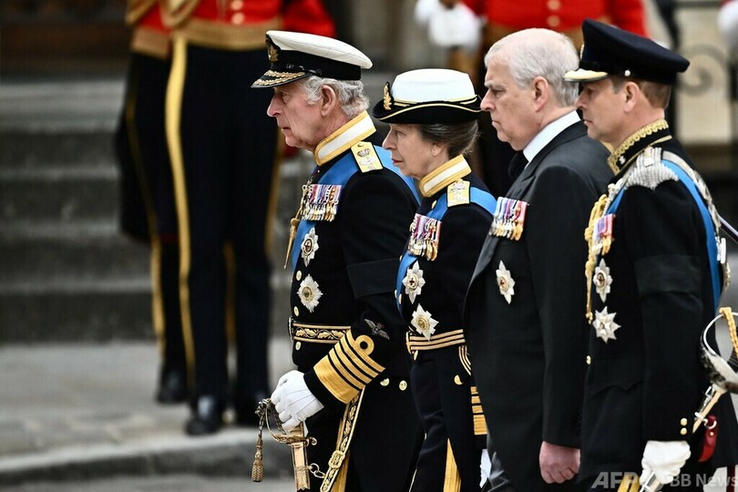 厳粛な雰囲気に包まれた葬列には、チャールズ国王(King Charles III)ら王室のメンバーが加わった。葬儀では、参列者らが2分間の黙とうをささげた。最後に、エリザベス女王の死去を受けて、歌詞が「ゴッド・セーブ・ザ・キング(God Save the King、神よ王を守りたまえ)」に変更された国歌が斉唱された。(c)AFP