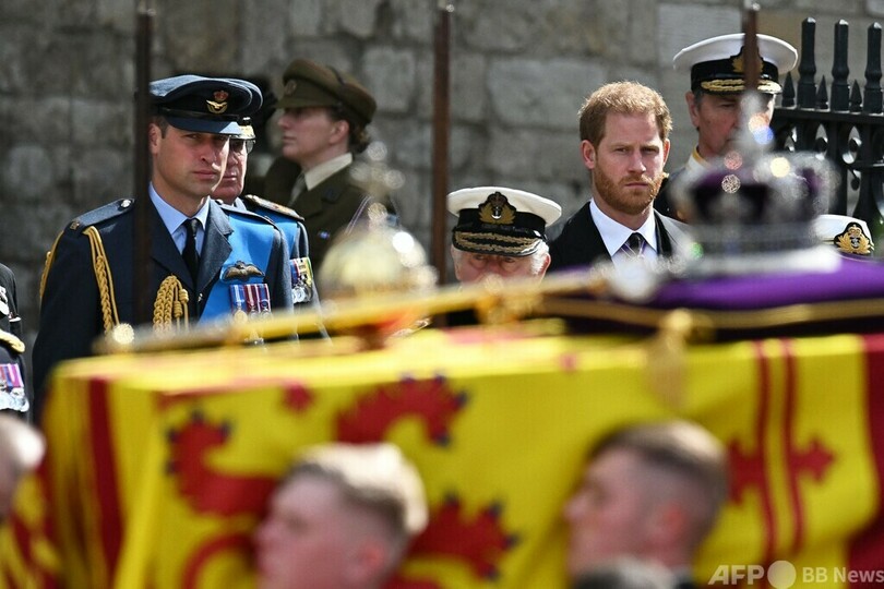 厳粛な雰囲気に包まれた葬列には、チャールズ国王(King Charles III)ら王室のメンバーが加わった。葬儀では、参列者らが2分間の黙とうをささげた。最後に、エリザベス女王の死去を受けて、歌詞が「ゴッド・セーブ・ザ・キング(God Save the King、神よ王を守りたまえ)」に変更された国歌が斉唱された。(c)AFP
